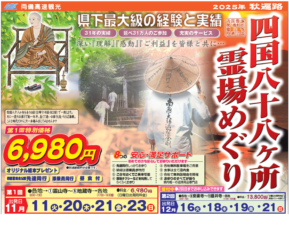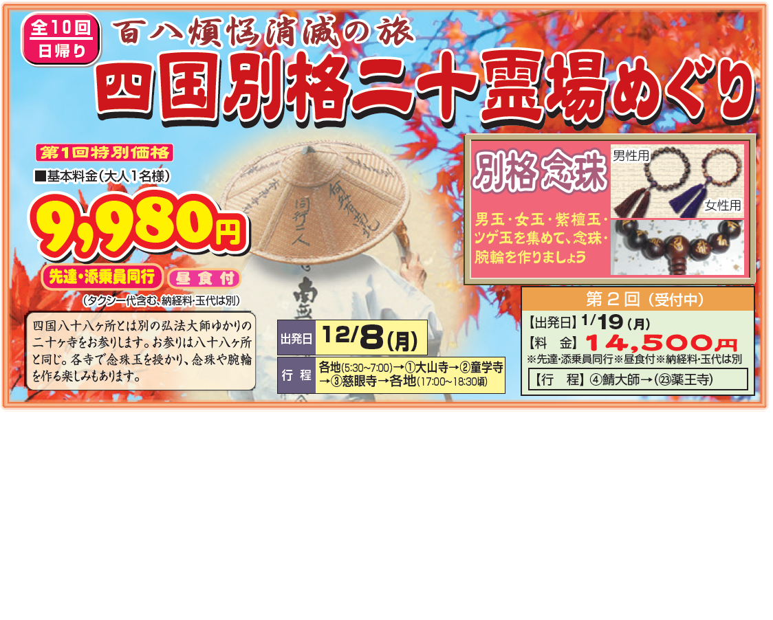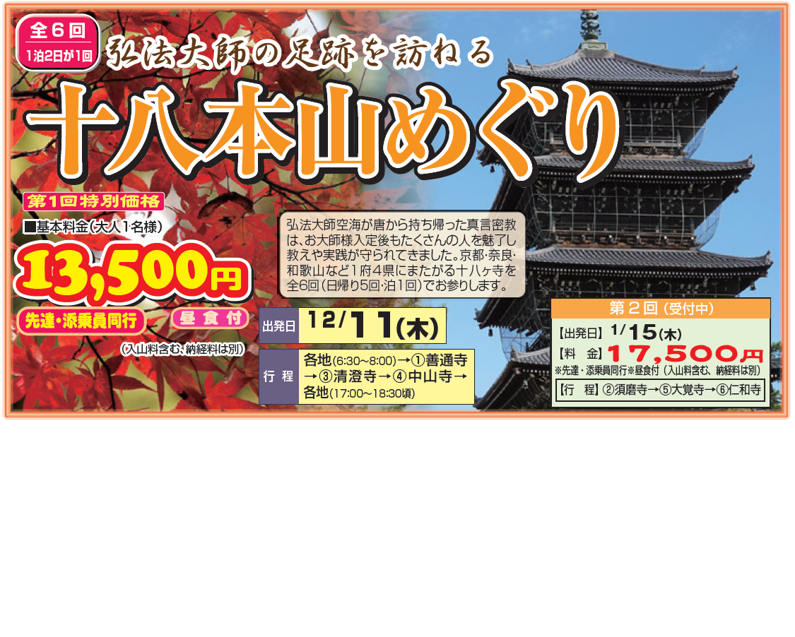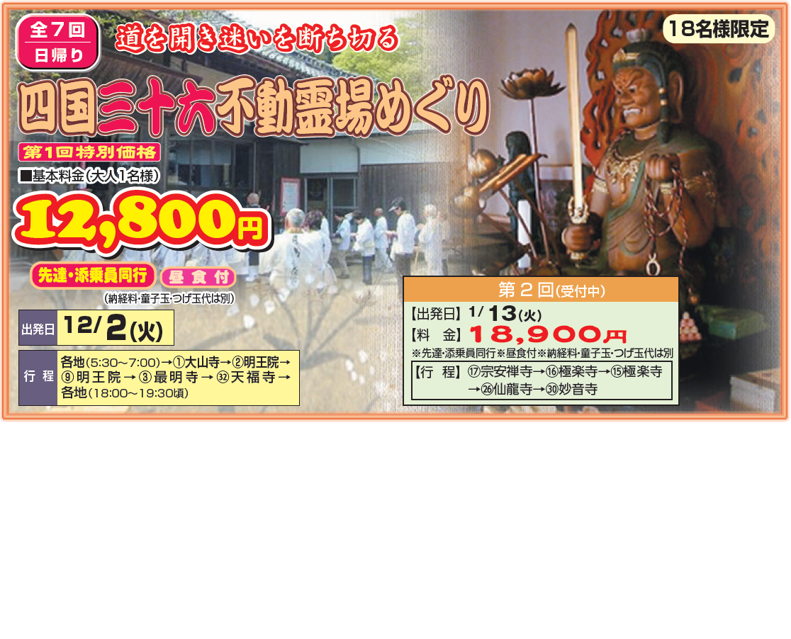 深い『理解』『感動』『ご利益』を皆様と共に・・・ 全18回(日帰り15回・泊まり3回)四国八十八ヶ所霊場めぐり | |