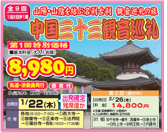 | 山陽・山陰を結ぶ名刹古刹 観音巡礼の旅 中国三十三観音巡り | |